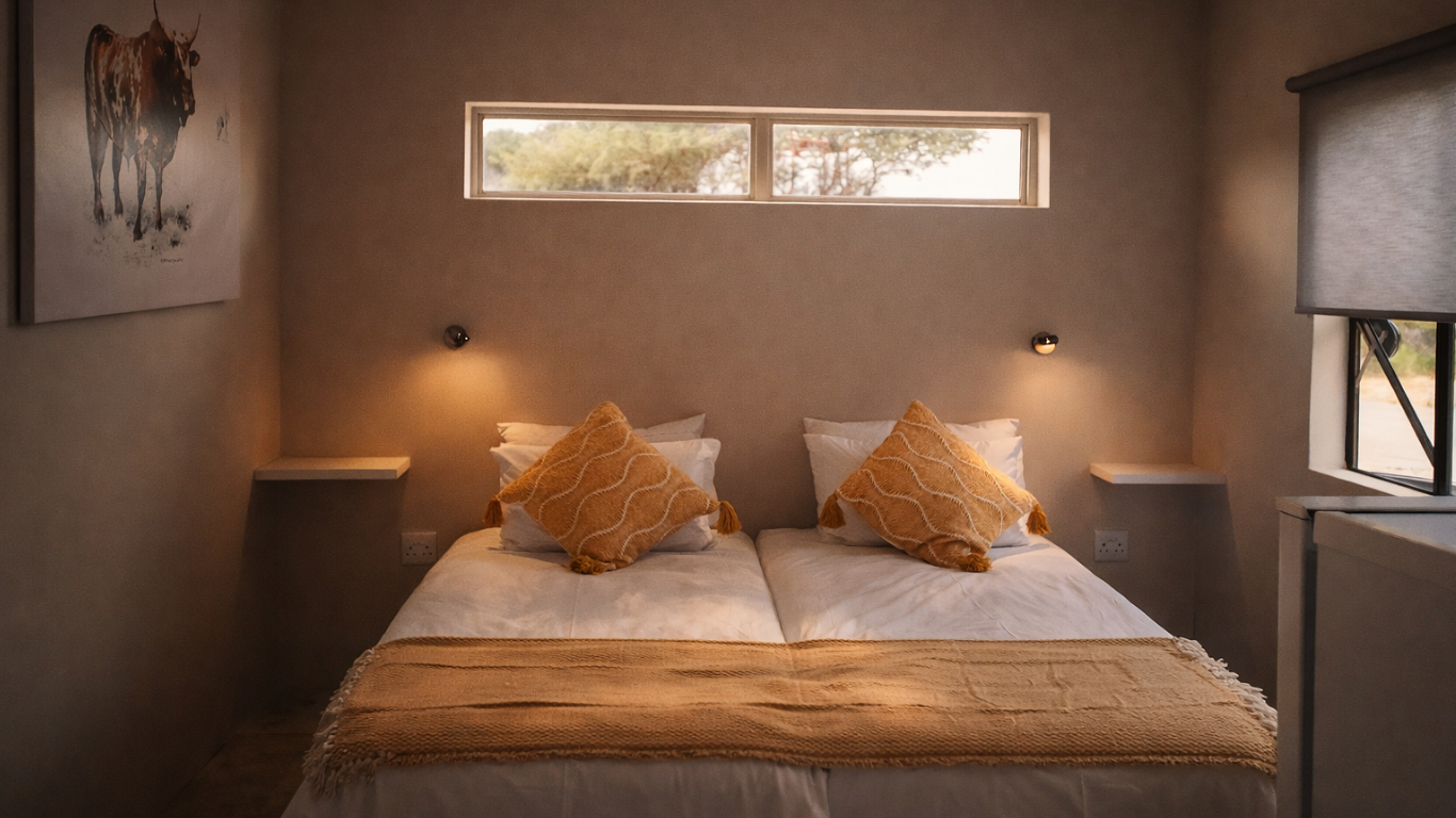 Each of our accommodation options has been thoughtfully designed to offer a balance of comfort, privacy, and refined elegance, allowing guests to unwind in a tranquil Kalahari setting. From spacious self-catering suites to immersive glamping and well-appointed camping sites, every space reflects careful attention to detail, modern convenience, and a connection to the surrounding landscape. Whether you are visiting for leisure, business, or adventure, our accommodation provides a welcoming retreat where relaxation, functionality, and authentic Kalahari charm come together effortlessly.